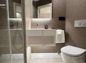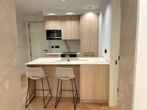 Área social diáfana, con salón comedor y cocina de diseño integrada, sin barreras arquitectónicas para facilitar las vistas desde sus balcones. La vivienda cuenta con dos dormitorios con vestidor y cuartos de baño en suite.